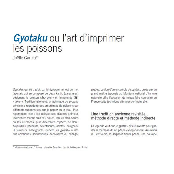 Traditionnellement, la technique du gyotaku consiste à reproduire des empreintes de poissons sur différents supports tels que le papier ou le tissu. Plus récemment, elle a été utilisée avec d’autres animaux invertébrés marins ou d’eau douce, tels les mollusques ou les crustacés, puis différentes espèces de flore.