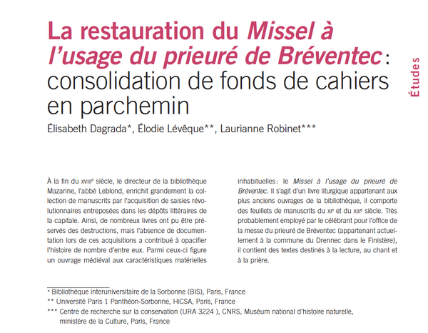Le Missel à l’usage du prieuré de Bréventec est composé de deux textes rédigés sur parchemin au XIe et au XIIIe siècles, protégés par une reliure de l’époque moderne. Il est aujourd’hui conservé à la bibliothèque Mazarine et aurait été acquis à la fin du XVIIIe siècle. L’étude et la restauration de cet ouvrage ont été menées dans le cadre d’un mémoire de fin d’études.