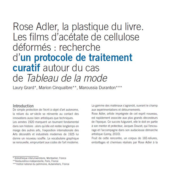 Rose Adler, la plastique du livre. Les films d’acétate de cellulose déformés : recherche d’un protocole de traitement curatif autour du cas de Tableau de la mode