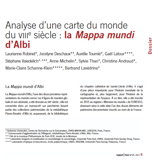 l’Index des vents et des mers associé sont inclus dans un manuscrit de 77 feuillets appartenant à la médiathèque Pierre-Amalric d’Albi. Étant d’une importance exceptionnelle pour l’histoire mondiale de la cartographie et, plus largement, pour l’histoire de la représentation de l’espace, la carte et l’index ont été inscrits en octobre 2015 au registre «Mémoire du monde » de l’UNESCO. En juin 2016, la Mappa mundi d’Albi a été apportée à Paris pour analyser les différents matériaux constitutifs de la carte et de son index afin de mieux comprendre les techniques de fabrication de ce document unique. Ainsi, l’imagerie sous différents rayonnements et à différentes échelles, complétée par des techniques spectroscopiques ponctuelles, a permis par croisement des informations de caractériser le parchemin et son état de conservation, les encres et les matières colorantes. Les résultats obtenus dans le cadre