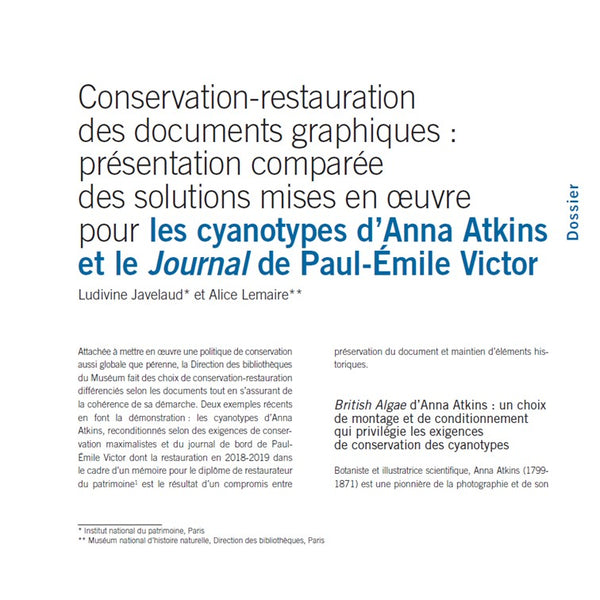 Conservation-restauration des documents graphiques : présentation comparée des solutions mises en oeuvres pour les cyanotypes d'Anna Atkins et le journal de Paul-Emile Victor