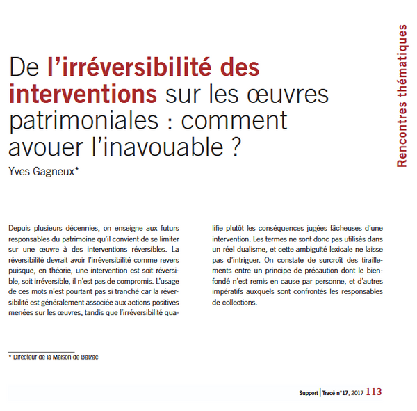 Il est généralement admis que les interventions sur les œuvres doivent tendre à une totale réversibilité. Les articles de synthèse sur les matériaux ou sur les procédés employés en restauration pointent systématiquement tout ce qui présente un caractère définitif, donc tout ce qui semble dommageable à la conservation des œuvres. Mais ces réserves et ces réticences disparaissent dès qu’il s’agit de présenter une opération concrète, que ce soit dans un article, un cahier des charges ou un rapport de restauration. Il existe lien un double langage et il convient de s’interroger tant sur les raisons de cette duplicité que sur ses