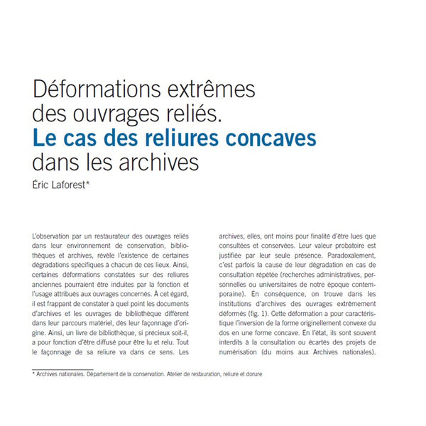 Le restaurateur de reliures anciennes est parfois confronté à une altération mécanique spécifique : la déformation de dos présentant une concavité extrême. Les registres d’archives sont particulièrement exposés à cette déformation qui ne se rencontre que très rarement
