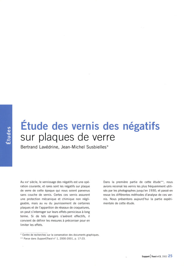 Au XIXe siècle, le vernissage des négatifs est une opération courante, et rares sont les négatifs sur plaque de verre de cette époque qui nous soient parvenus sans couche de vernis. Certes ces vernis assurent une protection mécanique et chimique non négligeable, mais au vu du jaunissement de certaines plaques et de l’apparition de réseaux de craquelures, on peut s'interroger sur leurs effets pernicieux à long terme. Si de tels dangers s’avèrent effectifs, il convient de définir les mesures à préconiser pour en limiter les effets.