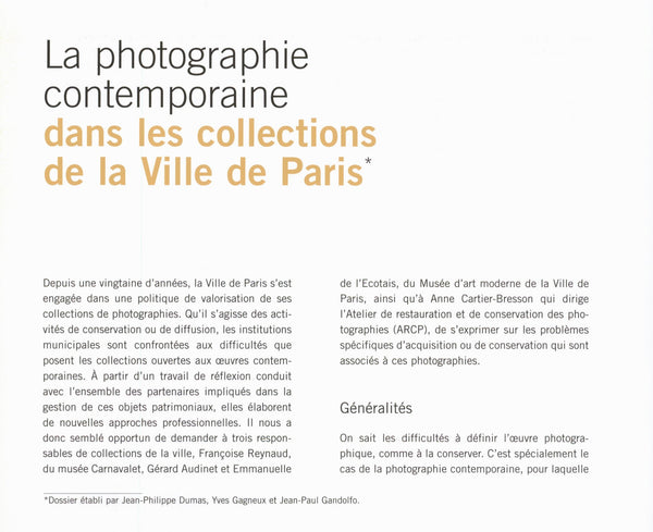 gestion de ces objets patrimoniaux, elles élaborent de nouvelles approches professionnelles. Il nous a donc semblé opportun de demander à trois responsables de collections de la ville, Françoise Reynaud, du musée Carnavalet, Gérard Audinet et Emmanuelle de l’Ecotais, du Musée d’art moderne de la Ville de Paris, ainsi qu’à Anne Cartier-Bresson qui dirige l’Atelier de restauration et de conservation des photographies (ARCP), de s’exprimer sur les problèmes spécifiques d’acquisition ou de conservation qui sont associés à ces photographies.
