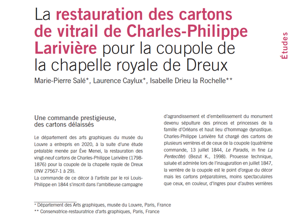 Le département des arts graphiques du musée du Louvre a entrepris la restauration de vingt-neuf cartons de Larivière, de grand format, pour la chapelle de Dreux. La commande de ce décor à l’artiste par le roi Louis-Philippe en 1844 s’inscrit dans l’ambitieuse campagne de modification et d’embellissement du monument devenu sépulture des princes et princesses de la famille des Orléans et haut lieu d’hommage dynastique. Les peintres d’histoire les plus appréciés du régime furent invités à composer des cartons pour les verrières sur un programme iconographique très précis. Ces cartons constituent la maquette d’ensemble en noir et blanc de la coupole représentant la Pentecôte, dont la forme, divisée en vingt-huit fuseaux disposés autour d’un tondo central, est déterminée par la structure des panneaux de verre. L’ensemble est complet. Les esquisses en couleur sont conservées au musée d’Art et d’Histoire de la ville de Dreux.