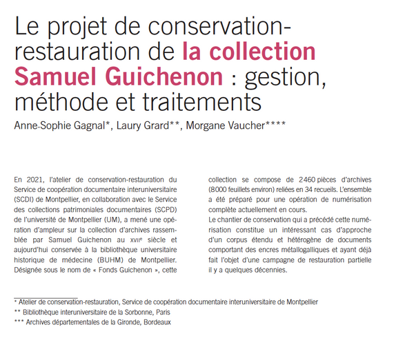 L’étude sur l’état de conservation de la collection, menée par l’équipe de l’atelier de conservation‐restauration du patrimoine documentaire des universités de Montpellier, a permis d’appréhender son état et de comprendre les choix d’intervention précédents non documentés, afin de définir un protocole d’intervention respectueux des contraintes temporelles et budgétaires.