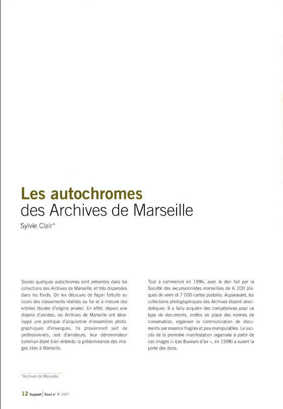 Seules quelques autochromes sont présentes dans les collections des Archives de Marseille, et très dispersées dans les fonds. On les découvre de façon fortuite au cours des classements réalisés au fur et à mesure des entrées (toutes d’origine privée). En effet, depuis une