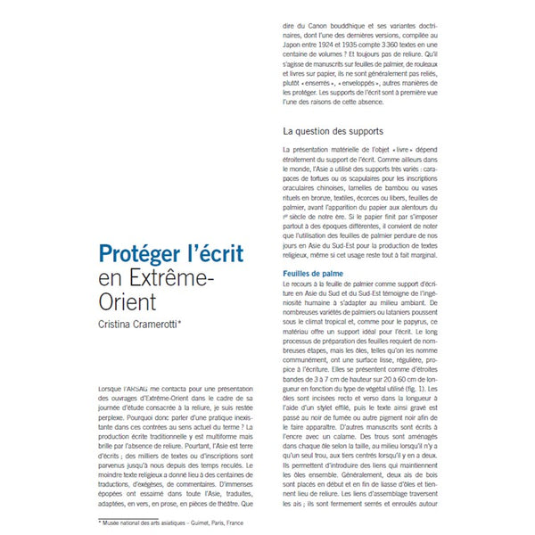 La notion de reliure au sens occidental du terme ne convient guère à la présentation des ouvrages traditionnels d’Extrême-Orient. Pourtant, au sens originel du terme latin religare, « lier ensemble », il n’est pas interdit de l’appliquer à ces livres, qui d’une manière ou d’une autre, sont maintenus en une entité close, finie, pour des raisons pratiques : protéger l’intégrité du texte, préserver l’objet en tant que tel, faciliter le rangement et la communication.