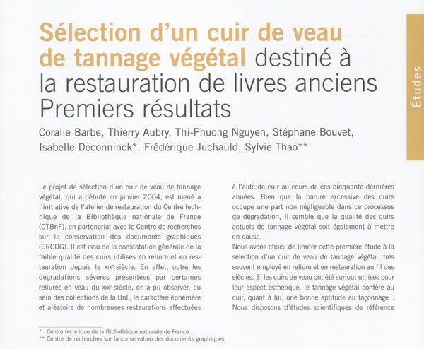 Le projet de sélection d’un cuir de veau de tannage végétal, qui a débuté en janvier 2004, est mené à l’initiative de l’atelier de restauration du Centre technique de la Bibliothèque nationale de France (CTBnF), en partenariat avec le Centre de recherches sur la conservation des documents graphiques (CRCDG).