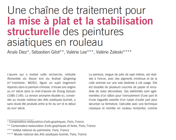 Cet article est consacré à la conservation-restauration d’une peinture chinoise en rouleau provenant des collections du musée Guimet, travail de recherche scientifique mené en 2022 dans le cadre d’un mémoire de fin d’études à l’Institut national du patrimoine. Ce rouleau horizontal de près de sept mètres de long présentait une série de plis prononcés parallèles à son axe d’enroulement, tels que fréquemment rencontrés sur ces oeuvres. La conservation-restauration des peintures